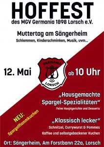 Wenn das Hoffest des Männergesangverein Germania Lorsch und Muttertag auf einen Tag fallen, 12. Mai, dann könnte das Tagesmotto – einem alten Werbespruch folgend – sein: ‚Heute bleibt die Küche kalt, wir gehen wir zur Germania bald‘; Am Forstbann 22, Beginn ab 10:00 Uhr.